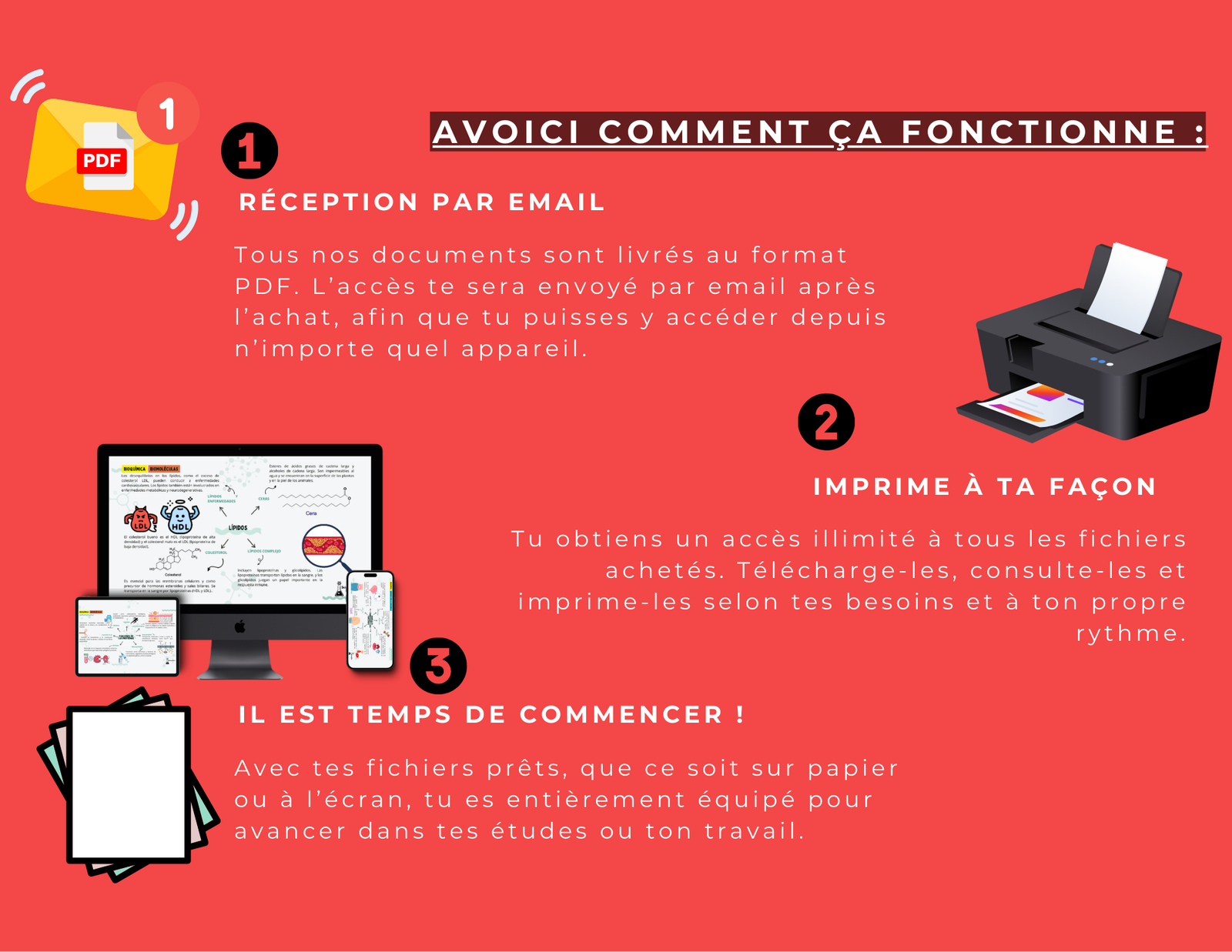 Une fois ton achat terminé, tu recevras un e-mail avec un lien qui t’enverra vers l’espace membre, où tu pourras télécharger le matériel au format PDF. Tu pourras y accéder à tout moment pour télécharger ou consulter tes documents.
